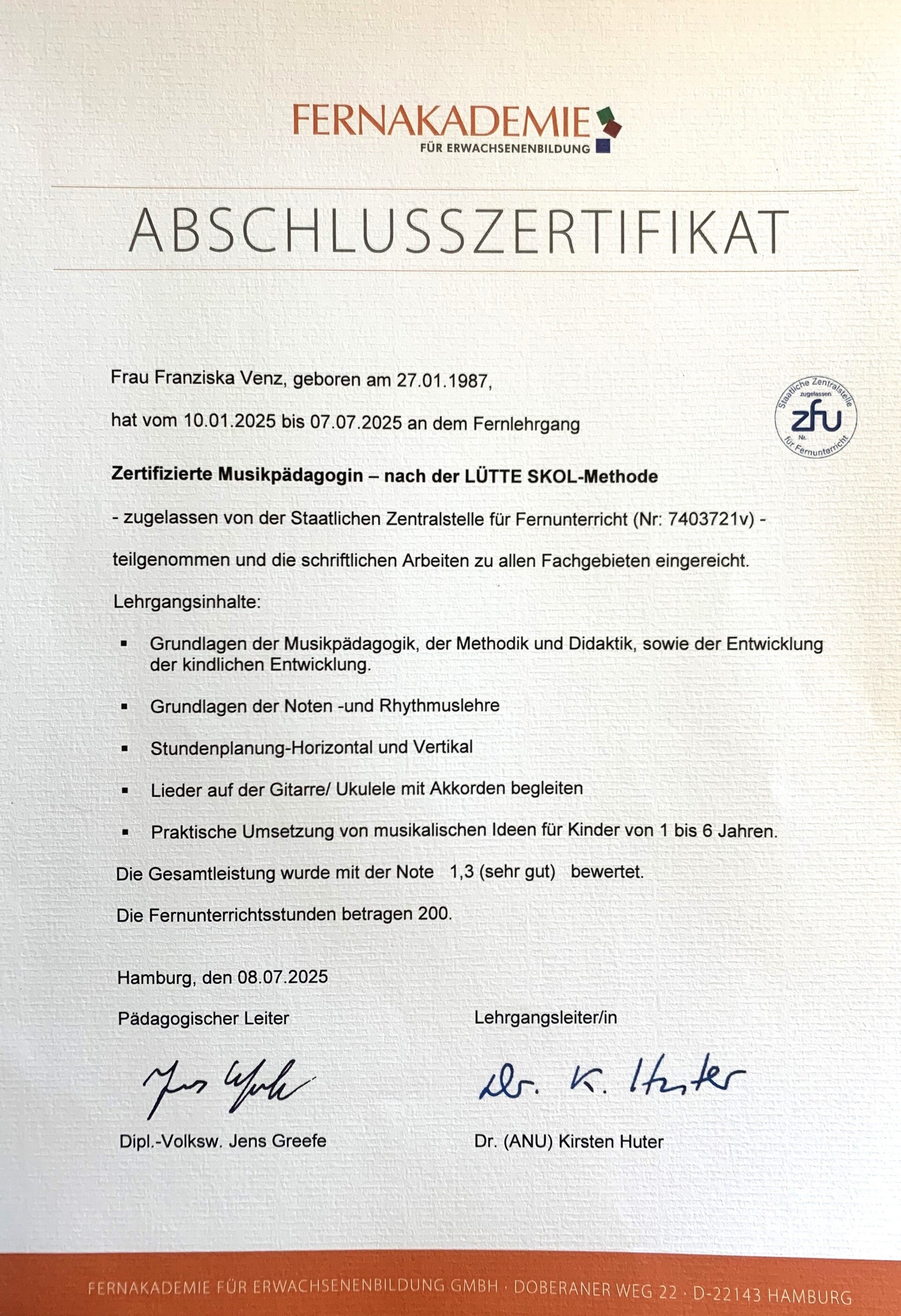 Ich bin Mutter von zwei Kindern und zertifizierte Musikpädagogin nach Lütte Skol. Die Musik wurde mir bereits in die Wiege gelegt, seit meiner Kindheit spiele ich mehrere Instrumente und liebe es, diese Leidenschaft weiterzugeben. Im örtlichen Kindergarten vermittle ich seit 2024 im Rahmen einer Elterninitiative Musik und habe dadurch meine Leidenschaft für die musikalische Arbeit mit den Kindern entdeckt. Musik und Kunst mit Kindern sind für mich mehr als nur ein Beruf – es ist meine Berufung.